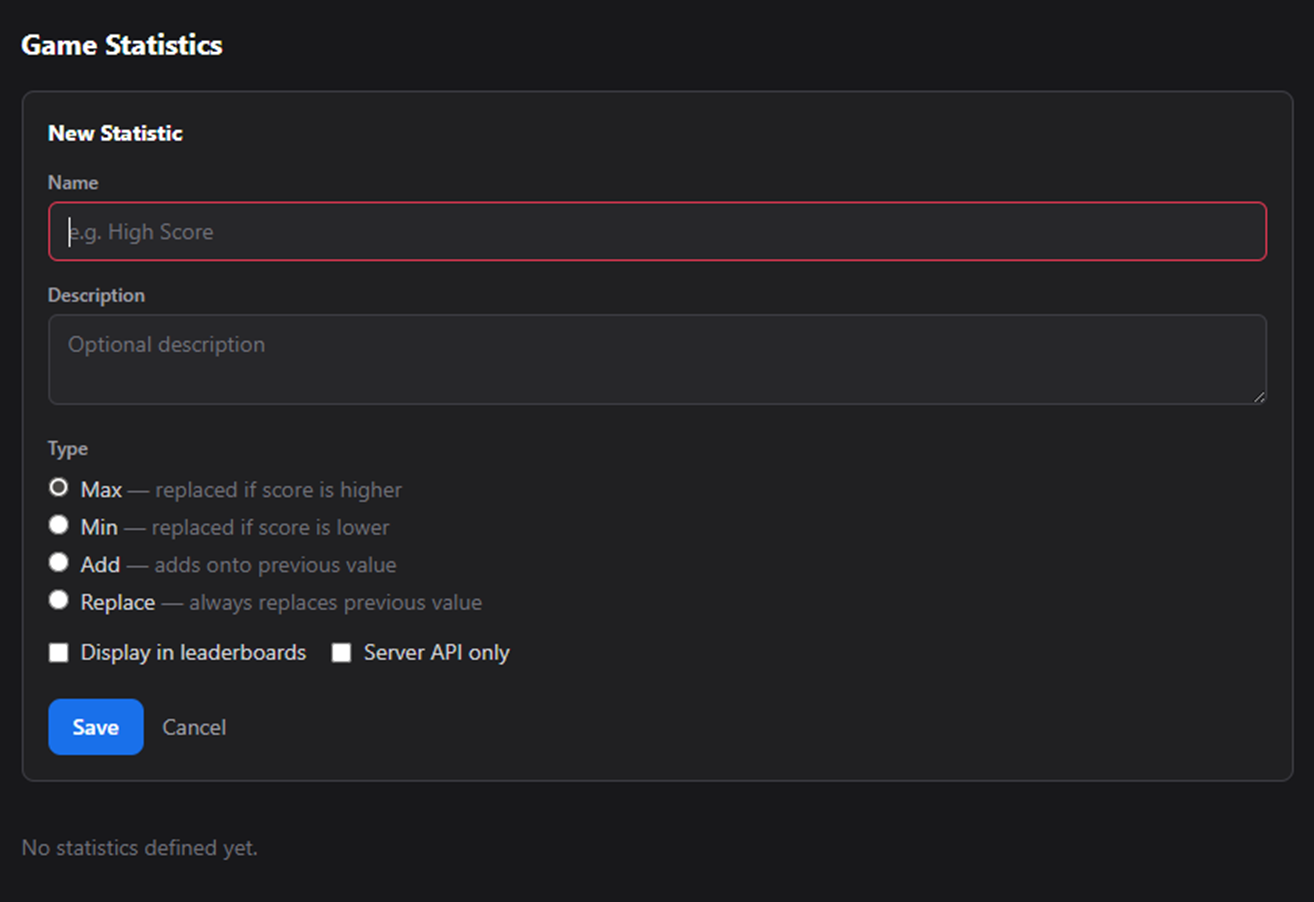 Click "Add Statistic", give each statistic a name, description, and choose it’s type. You can also select statistics you wish to show up in the leaderboards by checking the "Display in Leaderboards" option.